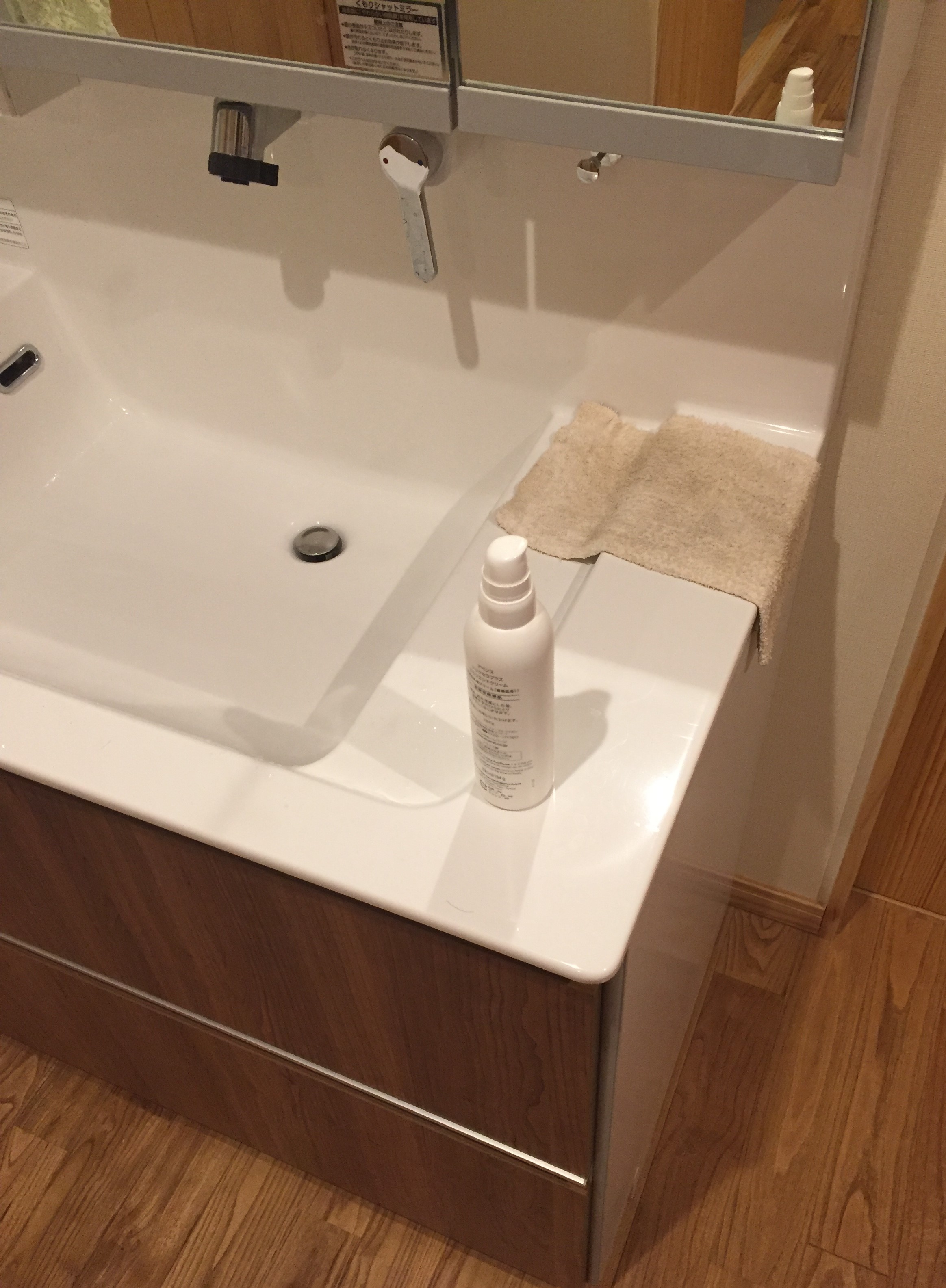 地震直後の室内の写真です。何も倒れていません。洗面台のボトルも倒れず立っていました。