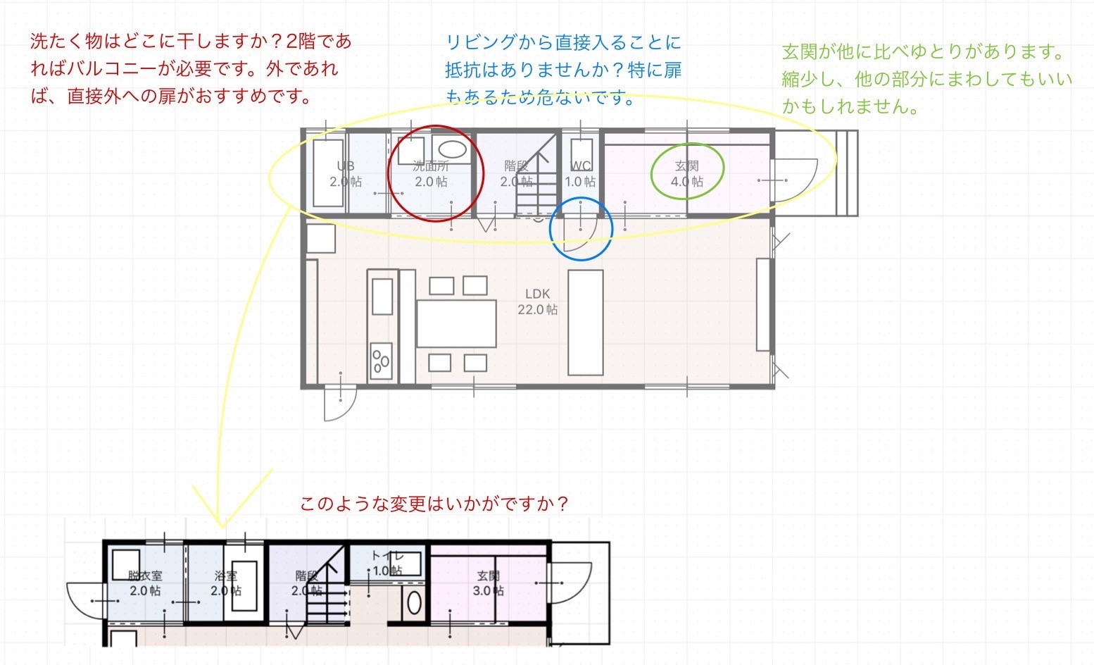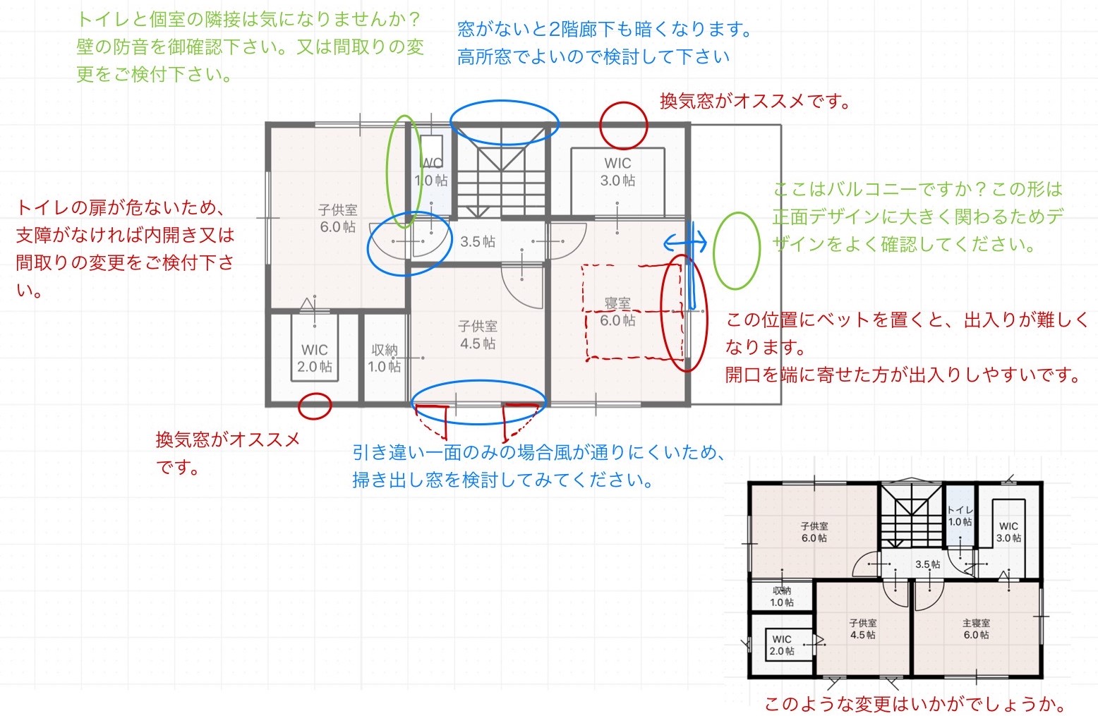2階については開口の変更が多くなりましたが、トイレの扉が動線と干渉している点については間取りの変更が必要なため、